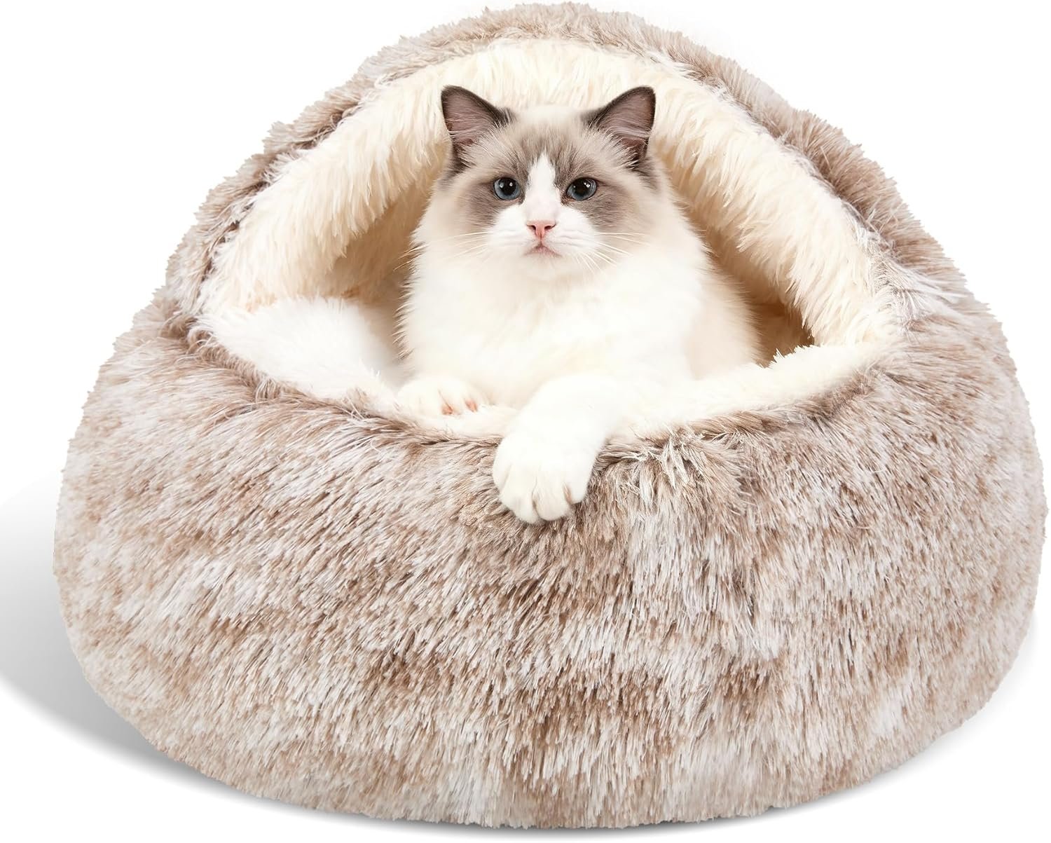 - 【Soft & Cozy Materials】This round calming covered bed is lined in fleece with a long-haired plush rim, which is a perfect place for your pet to rest and provide a secure area for cats of all sizes to hide in, helping reduce stress levels